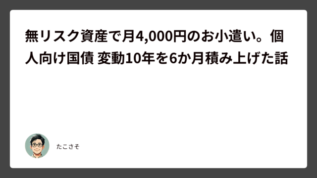 投資で増やす 無リスク資産で月4,000円のお小遣い。個人向け国債 変動10年を6か月積み上げた話 2026年4月11日 たこさそ 2026年4月 · 読了時間:約4分 .kb-tag-row { display:flex; gap:8px; margin-bo …