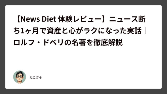お金の思考を鍛える 【News Diet 体験レビュー】ニュース断ち1ヶ月で資産と心がラクになった実話|ロルフ・ドベリの名著を徹底解説 2026年4月17日 たこさそ ※この記事には、PR・アフィリエイトが含まれています。 この記事のポイント(結論) 『News Diet』(ロルフ・ドベリ著 …